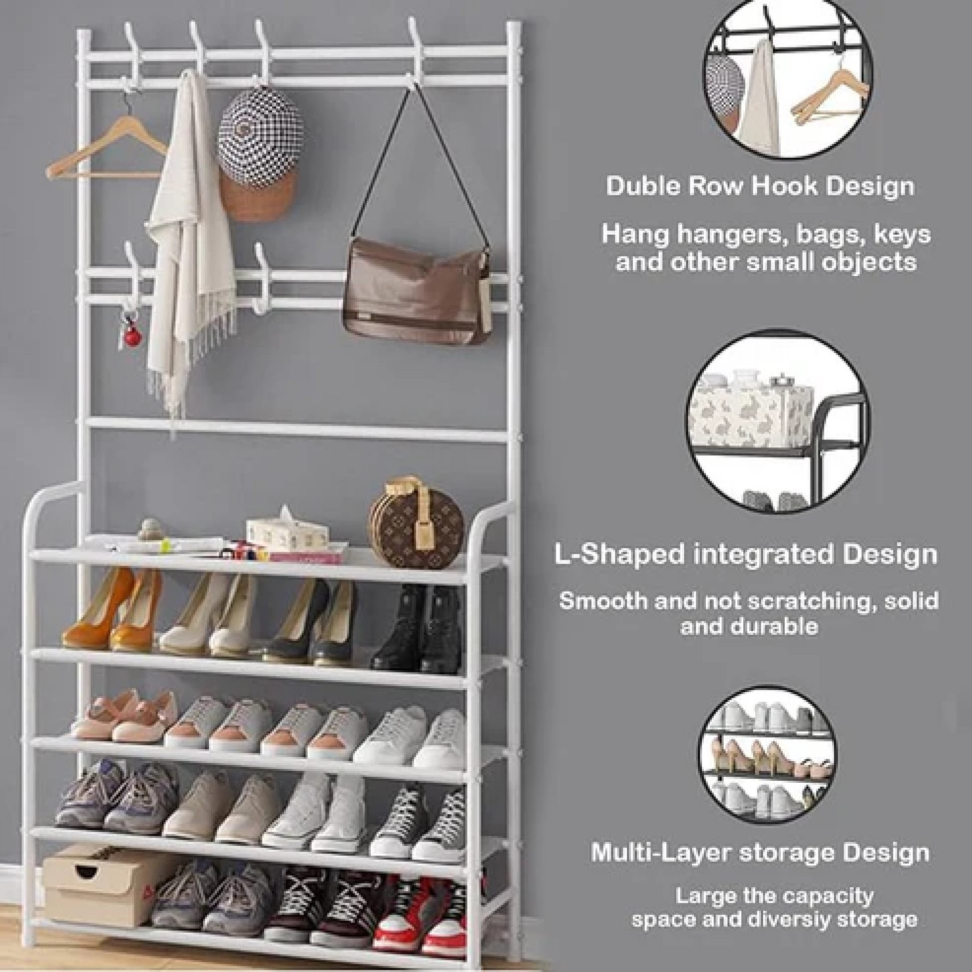 👟 Four Tier Metal Shoe Rack: Featuring a four-layer partitioned shoe rack, the first tier can store up to 15 pairs of shoes. The coat rack with a shelf is 172 cm long and includes 8 hooks for hanging clothes, scarves, umbrellas, bags, and more.